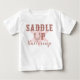 Vista sua pequena vaqueira com esta adorável camisa de aniversário Saddle Up Buttercup, apresentando uma ferradura western e distintivo de xerife em tons de rosa desbotado. Perfeita para primeiros aniversários com tema rodeio, festas country ou sessões de fotos western. Mac