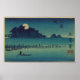 Fū keiga ~ Esta impressão de recorte de madeira mostra uma noite à lua com um homem martelando um pequeno barco à medida que a lua se ergue de trás de uma gruta de árvores. O artista: Andō Hiroshige (Utagawa Hiroshige), 1797-1858. (Nota: a borda do papel é criada digitalmente.)