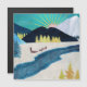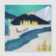 Uma paisagem digital com cores brilhantes e texturas mostrando um cogumelo com uma equipe de trenó de cão e um sol cor-de-rosa brilhante em tons de azul, ouro, ciano e amarelo.