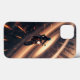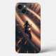 O motociclista silenciado atravessa uma paisagem futurista iluminada por neon, sob o pano de fundo de um planeta majestoso.