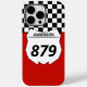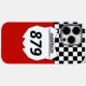 Esta capa de telefone de motocross personalizada tem um gráfico de placa de número branco que está pronto para ser personalizado com seu nome e número de bicicleta. A placa do número é definida sobre um fundo vermelho com uma borda de sinalizador de verificação em preto-e-branco.