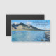 Shimmering blue lake and mountains landscape photography magnet. Cast your cares on Him, for He cares for you Bible verse from 1 Peter 5:7 inspirational quote.