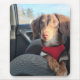 Kio é um Dachshund sentado num banco de carro esperando para ir à loja.