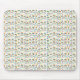 Mouse pad with a pattern of diverse smiley faces in multiple colors, creating a playful and cheerful atmosphere. Below, a white mouse rests on it.
