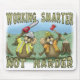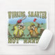 Um tapete do rato engraçado com uma imagem dos desenhos animados de dois castores com as ferramentas para facilitar seu trabalho e o provérbio "nao mais duro mais esperto de trabalho"