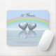 Dois corações de estanho ou alumínio flutuando na água sob um arco-íris. O texto personalizável diz "10 anos".
