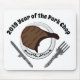 Uma picada de porco para o ano do porco. Ok, admito que quando churrasco gosto de cozinhar a carne em excesso. Este pedaço de carne queimado está em uma placa branca com uma faca decorativa e garfo que tem cabeças de pássaros sobre eles. Com o texto mutável que diz "2019 é o Ano da Corte de Porco"