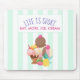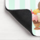 Mousepad com uma citação engraçada com uma ilustração de um sundae de sorvete de 3 furos com bordos coloridos. Um cone de sorvete com colheres de chocolate, morango e baunilha. Uma tigela de sorvete neopolita com uma cereja em cima. Morangos e uma fruta de abacaxi sentam ao lado das tigelas. Padrão de listras brancas e verdes em letras maiúsculas no fundo.