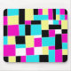 Um desenho abstrato original feito de retângulos e quadrados irregulares em rosa, amarelo, azul ciano e preto.