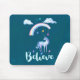 Um mouse pad com uma bela ilustração. Um unicórnio aquarela parado debaixo de um arco-íris com nuvens fofinhas e estrelas balançando. A tipografia diz Acredite. Colocado sobre um fundo verde azul escuro.