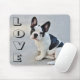 Este mouse pad divertido apresenta um retrato de um cachorrinho preto e branco do Bulldog francês sentado em uma cinza pavimentada com amor impresso em uma fonte preta e em negrito.