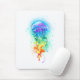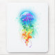 Água-viva grande, iridescente, desenhada artisticamente, brilhante, com longos tentáculos em branco, pintada sobre fundo de aquarela multicolorido. Água-viva arco-íris.