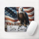 Uma águia careca sentada sobre uma cerca de madeira com um texto "vota cedo" num cartaz branco e uma bandeira americana está ao fundo