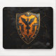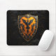 Um poderoso mousepad com um emblema de fênix ascendente em âmbar brilhante e ouro derretido. Situado em uma moldura vulcânica escura com detalhes intricados de refração de luz e um fundo preto de mármore texturizado com veias douradas. Design de alto impacto para conquistas lendárias em jogos.