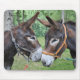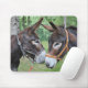 Uma foto de dois asnos cinzentos marrons amigáveis que tocam nos narizes com um fundo da grama e das árvores. Olham muito bonitos com suas orelhas dianteiras e anéis brancos em torno de seus olhos delicados. A fotografia foi tomada em uma mostra em France onde os asnos são muito populares.