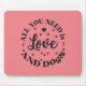 "Amor e Cachorros" Era o Pad do Mouse. : Um "Pad do Mouse com Amor e Cachorros" com um gráfico circular branco com a frase "TUDO QUE PRECISAMOS É AMOR E CÃES", acentuado por corações e estampas de pata. Este "Amor e Cachorros" Themed Mouse Paditem apela aos entusiastas dos cães e promove o amor como um sentimento essencial.