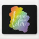 Esta trendy mouse pad apresenta uma citação inspiradora em um roteiro escrito à mão que diz "O amor não vê cor" contra um fundo de aquarela arco-íris.