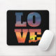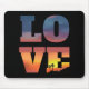 Uma praia tropical é o lugar perfeito para o amor! Linda cobertura de texto de nocaute com letras empilhadas da palavra AMOR. Uma cena solar tropical colorida com palmeiras na silhueta mostra através das letras de bloco sobre fundo preto.