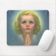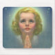 Ilustração Vintage de design religioso do Cristianismo apresentando um retrato de uma jovem loira em oração. Ela parece um belo anjo com halo ou aura e está cercada por estrelas no céu.