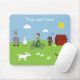 Mousepad bonito/mousemat com animais dos desenhos animados (cabra, asno, borboleta, cães, e filhotes de cachorro que perseguem um gato) e um menino que monta uma bicicleta. Personalize o texto para serir suas necessidades clicando no "personalizam-no" o botão - cargas das cores e das pias batismais para escolher de.