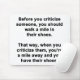 Para o amante sarcasmo em todos nós. Confira esta bruxa "Antes de criticar alguém, você deveria andar um monte em seus Calçados. Dessa forma, quando você os criticar, você estará a um monte e terá seu design no roupa, canecas, mousepads, botões e outros presentes exclusivos