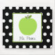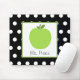 Um mousepad que caracteriza uma ilustração de uma maçã verde dentro de um quadrado branco com guarnição verde. Personalize com seu nome sob a maçã. O fundo é preto com bolinhas brancas.