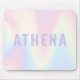 Pasta de rato personalizada, de tendência, com um fundo de padrão de arco-íris pastel macio e o seu nome em roxo claro.