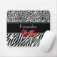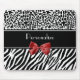 Um mousepad animal preto e branco na moda do teste padrão com as listras modernas da zebra na parte inferior e um leopardo à moda imprimem na parte superior e embellished com uma fita vermelha feminino amarrada em um arco. Personalize esta almofada chique da forma das mulheres adicionando seu nome. Imagem lisa, fita nao real.