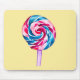 Uma ilustração original de um doce em um bastão, uma coloração gigante e colorida, do pirulito. Rosa, roxo e azul.