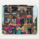 Edifício urbano abandonado com arte de grafite rosa e azul caindo e se desmoronando. Postar apocalíptico.