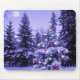 Roxo com destaques de cor-de-rosa e do branco. Árvore de Natal iluminada na noite na floresta nevado pelo luar.