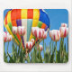 Ascensão de balão de ar quente acima de um jardim de tulipas primavera.
