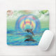 2 golfinhos que nadam no oceano perto de uma ascensão bonita das cores e da água com 2 planetas, uma lua e um sol colorido. Cores cor-de-rosa, azuis, do aqua, as amarelas e as verdes na água e no céu.