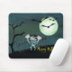 Ótima ilustração de Halloween de uma múmia em uma cena noturna assustadora com uma lua de cheio, árvore de morto e morcegos. Um texto de Feliz Halloween muito detalhado em cor amarela e fonte assustadora.