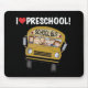 Um auto escolar amarelo encheu-se com os miúdos e o texto que me lê "o pré-escolar (do coração)!" é caracterizado em t-shirt prées-escolar do professor e do estudante, sacolas da escola, etiquetas, mousepads, ímãs, cartões, e mais!