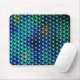Mousepad gel com imagem de fundo núcleos azul e verde, em diferentes toneladas e tonalidades sobre imagem círculo que dá a percepção de ter esferas sob a imagem de fundo.