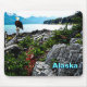 Uma pintura digital de uma águia careca empoleirada em uma torre de madeira derivada lavada na costa rochosa do Alasca; montanhas ficam à distância. A leitura de texto "Alaska" também é exibida.
