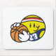 Os esportes do basquetebol da cara do sorriso projetam com o sorriso que veste uma banda do suor, vestindo um jérsei, e guardarando um basquetebol. É um design do basquetebol do divertimento para miúdos e adulto igualmente!