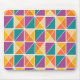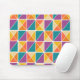 Este mouse pad tem um design Bauhaus de quadrados feitos de triângulos em tons de laranja, amarelo, roxo e azul.