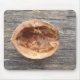 Eine grosse, leere, hellbraune Baumnusshälfte auf dunkelbraunem Holz ist das Motiv auf diesem Mousepad.