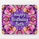 Este é um tapete chic com uma saudação floral de aniversário adequada para todos os grupos etários. É uma imagem gerada por computador criada na Gencraft com meus prompts. Eu o personalizei com o nome Beth. É um presente de aniversário barato para Beth.
