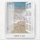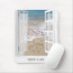 Abertura de janela com cortinas com vista para a praia e corações com nomes de casais. Os nomes dos casais são editáveis.