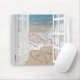 Abertura de janela com cortinas com vista para a praia e corações com nomes de casais. Os nomes dos casais são editáveis.