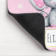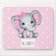 Um mouse pad com uma ilustração de aquarela elefante rosa giro. Ela tem orelhas bolinhas brancas e cor-de-rosa e um arco de fita rosa bonito em cima de sua cabeça.