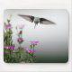 Um beija-flor se aproxima de uma flor por cima. Perspectiva incomum.