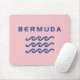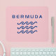 A design estilizada mostra três ondas oceânicas ou de água e a palavra "Bermudas" acima em um legal texto moderno. Design é tudo azul. Cor de fundo rosa das Bermudas. Design náutica minimalista para surfistas, iates, gabões, marinheiros, nadadores, narradores nas Ilhas Bermudas. Para os bermudianos, visitantes, marinheiros e turistas, buscando uma lembrança legal.