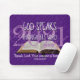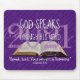 PÁD de MOUSE personalizável de Escritura roxa moderna, mostrando a imagem de Bíblia aberta com ano personalizável em tipografia decorativa manual. As palavras DEUS FALA ATRAVÉS DE SUA PALAVRA aparecem em branco, com um verso e uma referência de Bíblia personalizáveis, que você pode personalizar com sua própria Escritura favorita ou adicionar seu nome. Ao fundo há um sutil padrão de PALAVRA INSPIRATIVA DE DEUS. Outros itens semelhantes estão disponíveis no DGOD HAS A ÚLTIMA coleção SAY por Designs Bereanos. Vem em cores diferentes.