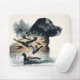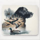 Dupla exposição de um retrato negro de cão Labrador Retriever e patos-reais com cattails na lagoa
