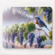 Um pássaro azul se senta sobre uma videira, cantando como notas musicais negras fluem de seu bico