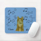 Gato listrado de laranja com rosto branco e peito é rodeado por múltiplas notas musicais voadoras. Personalize alterando o fundo azul para uma cor de sua escolha.